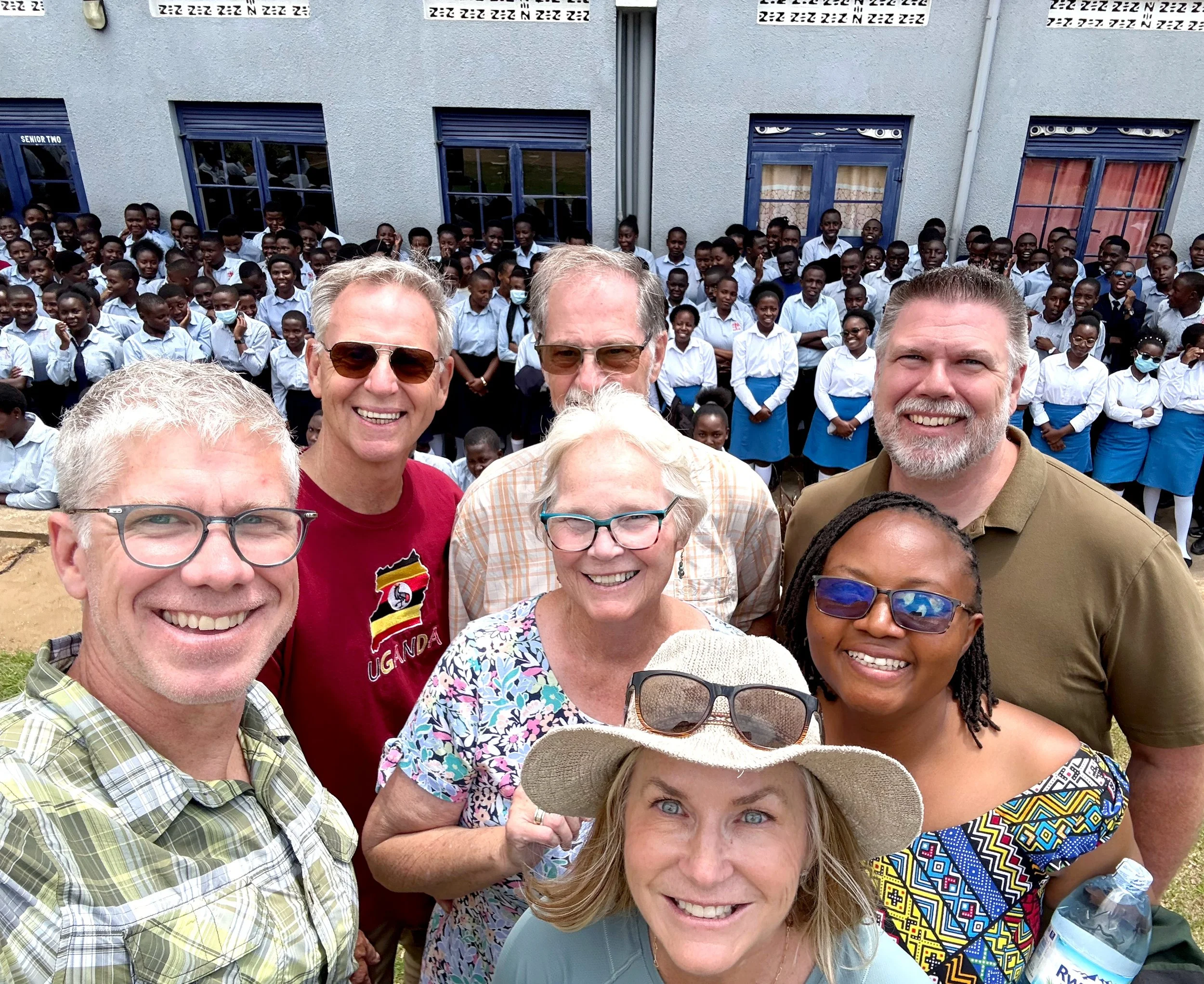 Board Chair Terry Oman, Pastor Bruce Van Dusseldorp, Operations Manager Tommy Kilpatrick, Country Director Grace Karungi, Executive Director Lory Barton, Maggie Van Dusseldorp, Dave Barton
